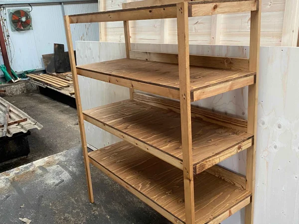 Industrial-strength shelving for storing paint tins, tools, hardware, or garden supplies. Four shelves provide ample storage capacity while keeping items organized and visible. Choose size based on available wall space.