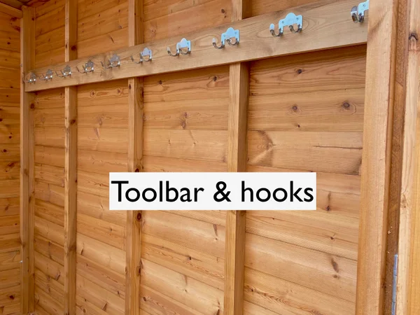 Wall-mounted tool bar with hooks for hanging tools and equipment.